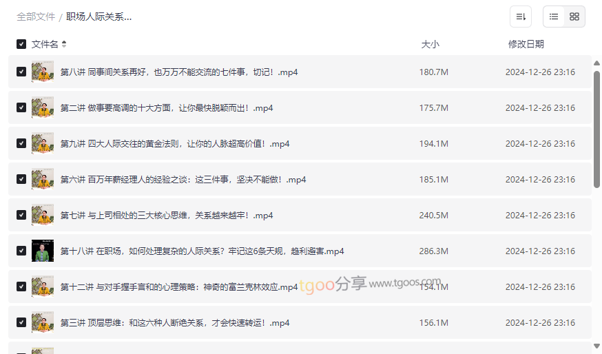 “职场人际关系学”作为职场生存与晋升的核心技能,在现代竞争激烈的职场环境中愈发重要。本资源集合了 18堂处世绝学课程,涵盖同事关系处理、领导互动技巧、人脉拓展策略、沟通陷阱规避,以及成为老板心腹的黄金法则 等多维度内容,将传统职场经验与现代心理学结合,适合: