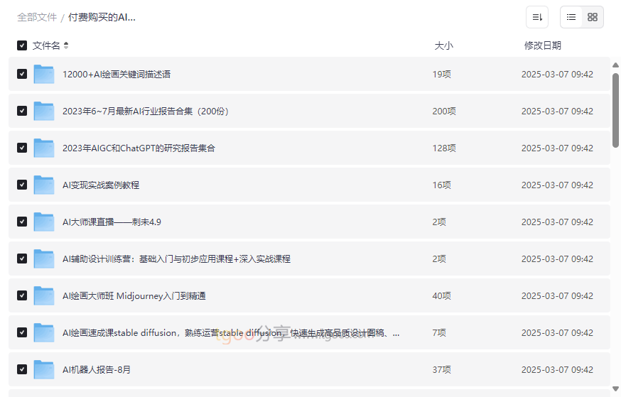 在人工智能浪潮席卷全球的背景下,掌握AI技术已成为个人与企业发展的关键。本资源整合了 134GB高质量AI课程与行业报告,涵盖ChatGPT、Midjourney、Stable Diffusion等热门工具的教学内容,以及2023年最新AIGC行业分析、机器人技术趋势报告等权威资料。无论是想系统学习AI技术,还是寻求商业变现机会,本资源库均能提供全方位支持,适合: