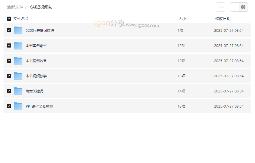 每章配备独立关键词文档,帮助用户精准掌握AI视频生成的核心指令。此外,提供所有资源大汇总文档,方便用户整体查阅和使用。 - PPT课件全套教程