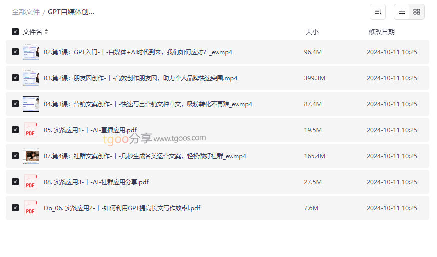 在人工智能浪潮席卷各行各业的今天,GPT技术正成为内容创作者的全新利器。本套《GPT自媒体创作课》资源包,专为希望借助AI提升创作效率的自媒体人量身打造,汇集了 GPT入门指南、朋友圈内容创作、营销文案撰写、社群运营文案、直播应用技巧、长文写作效率提升 等六大核心模块,全面覆盖自媒体创作全流程。课程通过 实操视频讲解+配套PDF实战指南 的形式,帮助学员系统掌握GPT在内容创作中的高效应用。适合: