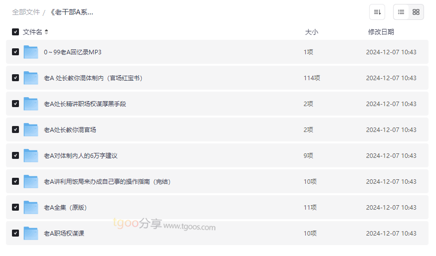 《老干部A系列全集》是一套专注于官场与职场生存智慧的权威指南,由经验丰富的体制内人士“老A”亲授。这套资源全面涵盖了官场规则、权谋手段、职场晋升、人际处理、饭局学问、送礼技巧等核心内容,旨在帮助用户在复杂的体制环境中游刃有余。无论是初入职场的新人,还是希望突破瓶颈的资深人士,这套资源都能提供实用且深入的指导。适合: