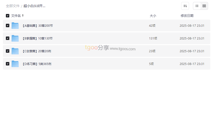 “超小白从0开始学Ps教程”是一套专为零基础用户设计的Photoshop系统课程,覆盖从基础操作到高级创意的完整学习路径。本资源整合了A基础篇、B掌握篇、C创意篇、D练习篇四大模块,包含30章200节基础课程、10章130节进阶技巧、20个创意案例及365个实战练习,配合全套课件素材,真正实现从入门到精通的一站式学习体验。这套高质量网盘资源特别适合: