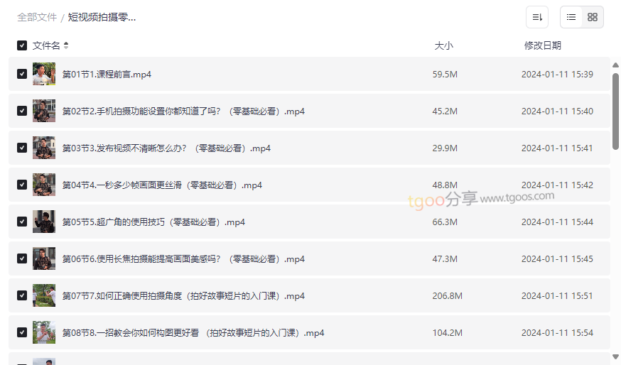 “短视频拍摄零基础进阶实战学习教程”是一套专为短视频创作者设计的系统性实操课程,从手机基础设置到高级拍摄技巧全覆盖。本资源整合了 30节高清视频课程,内容涵盖设备操作、构图运镜、光线运用、分镜头设计及剧情短片拍摄等核心模块,将理论知识与实战演练紧密结合,适合: