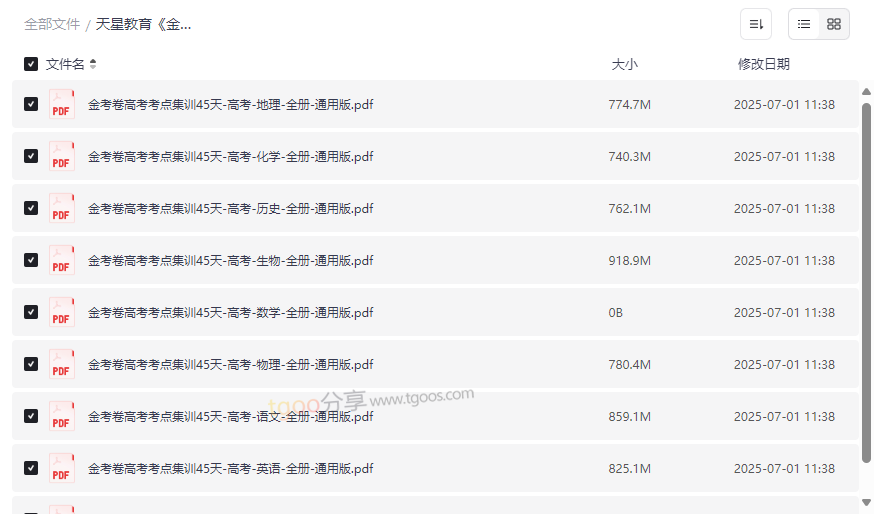 资源包含语文、数学、英语、物理、化学、生物、政治、历史、地理共9科,每科独立成册,内容与高考考纲完全同步。通用版PDF格式便于打印或电子设备学习,满足不同场景需求。 - 理科组合(数学/物理/化学/生物)—— 侧重逻辑推理与实验题型突破