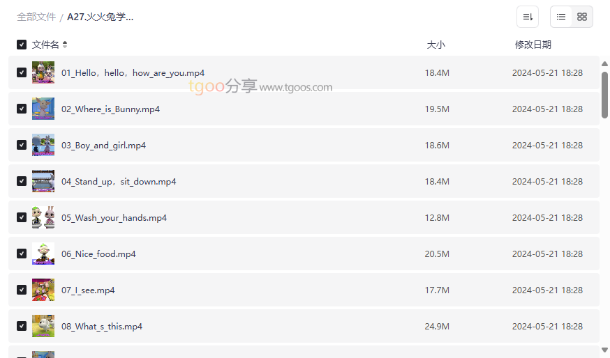 “火火兔学前英语”专为3至8岁幼儿设计,是一套集趣味性、互动性和教育性于一体的英语启蒙资源。通过生动的动画、简单的对话和日常情景,帮助孩子在轻松愉快的氛围中建立英语语感、掌握基础词汇。本资源包含19个主题视频,涵盖问候、动作指令、食物认知、节日文化等多元内容,将语言学习与生活场景紧密结合,适合: