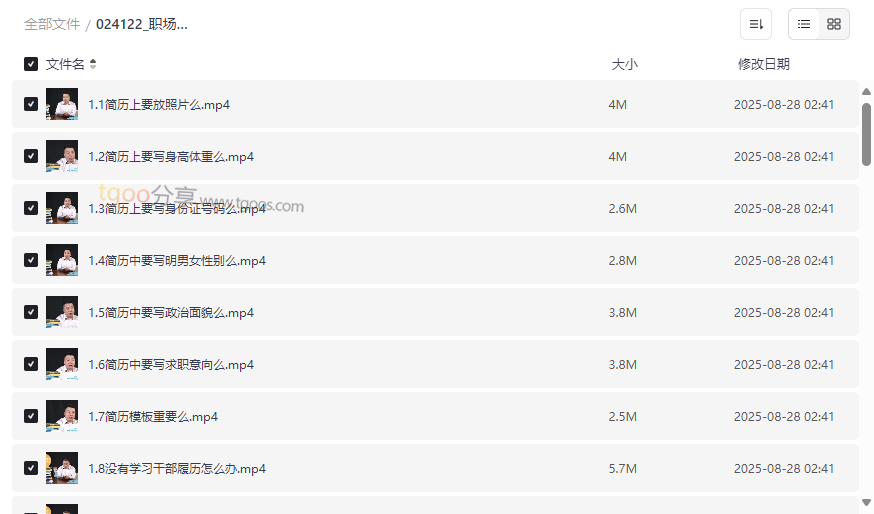 “职场千问-简历篇”是一套全面系统的简历制作指导资源,涵盖了从基础信息填写到高级优化技巧的108个关键问题。本资源通过视频讲解形式,深入剖析简历制作的每一个细节,帮助求职者打造专业、精准、高效的简历,提升求职成功率。这套资源特别适合: