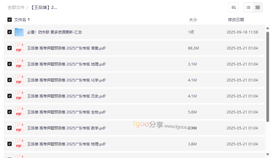 “王后雄”作为高考教辅领域的金字招牌,其《高考押题预测卷》系列凭借精准的命题预测和高质量的题目解析,深受广大师生信赖。本次分享的 2025版《高考押题预测卷》(广东专版) 专为广东省高考考生量身定制,全面覆盖语文、数学、英语、物理、化学、生物、政治、历史、地理九大学科,并附有详细答案解析。资源还贴心地提供了 防失联更新指南,确保考生能够持续获取最新备考资料。本套资源适合: