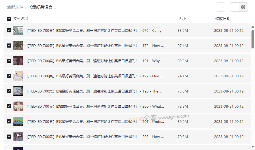 TED-ED作为全球知名的教育视频平台,以其生动动画+权威解说的独特形式,成为英语学习者提升口语和拓展知识视野的利器。本资源精选700集高质量TED-ED视频,覆盖科学、历史、文学、心理学、科技等多元领域,每集5-10分钟的短小篇幅,搭配英文字幕+部分中文字幕,既能强化听力理解,又能积累地道的英语表达。适合: