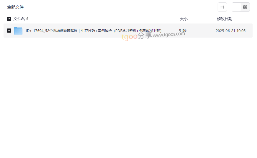 在当今竞争激烈的职场环境中,无论是初入职场的应届生还是经验丰富的资深人士,都难免遇到各种职业发展难题。这份 《52个职场难题破解课》 资源包,通过系统化的视频课程和PDF学习资料,全面覆盖了职业规划、人际关系、升职加薪、跳槽决策等关键职场场景,提供了实用的生存技巧和真实案例解析。本资源特别适合: