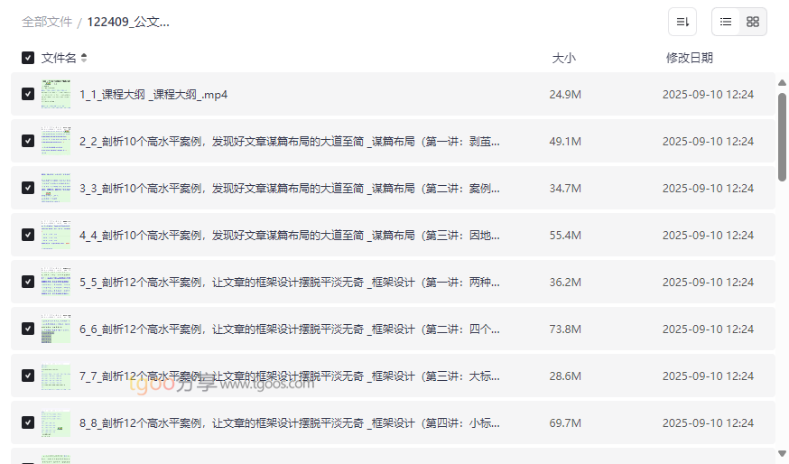 “公文写作进阶课”作为职场技能提升的核心课程,专为希望提升写作能力的职场人士设计。本资源集合了 谋篇布局、框架设计、遣词造句、调研文章写作、领导讲话稿撰写 等关键模块,通过 50+个高水平案例剖析,系统化拆解公文写作的核心技巧,帮助学习者从基础到精通,快速成长为“职场老笔杆子”。课程内容覆盖多种公文类型,结合实战案例与分步讲解,适合: