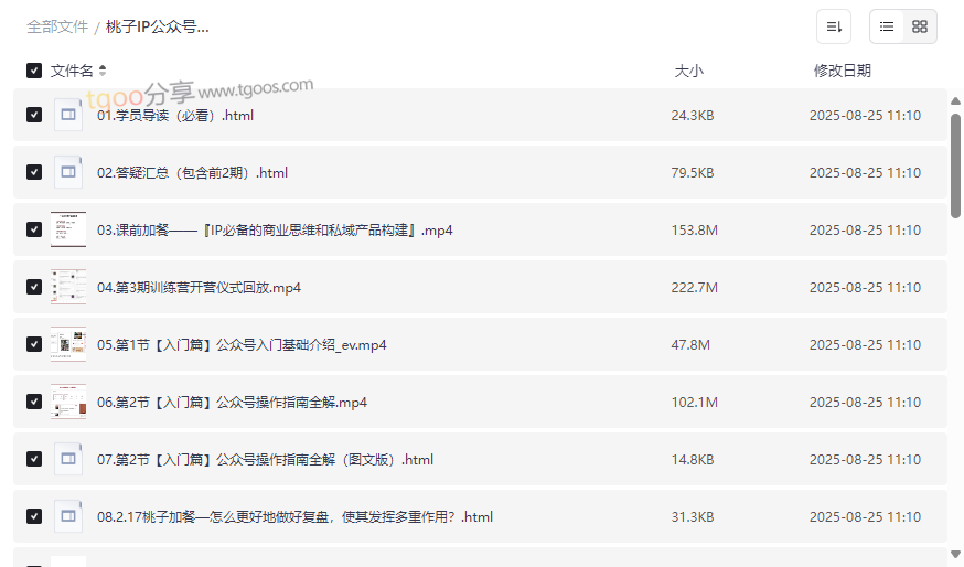 在当下内容为王的时代,公众号依然是个人与企业IP打造、精准获客和私域变现的核心阵地。“桃子IP公众号内容获客训练营”是一套从定位到爆款、从内容到营收的全链路实战课程,由经验丰富的运营专家桃子主讲,覆盖公众号运营的各个环节。本资源整合了第三期训练营全部视频课程、加餐直播、图文指南与答疑汇总,内容系统、案例详实、方法可复用,适合: