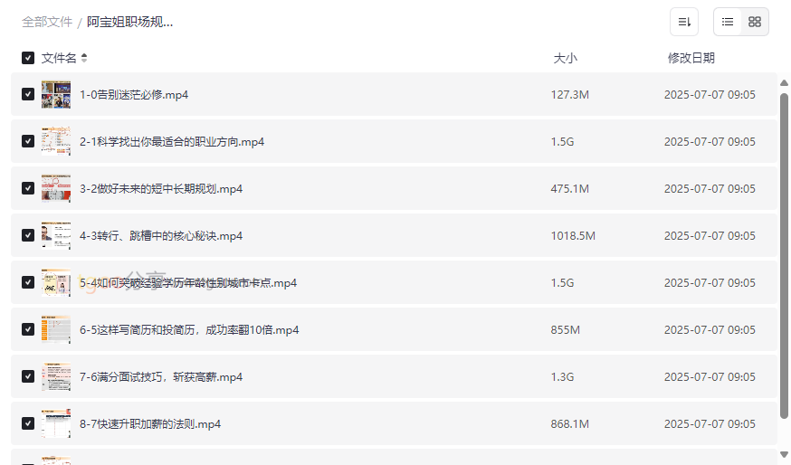 “阿宝姐职场规划课”是一套系统化的职业发展指南,专为现代职场人士设计,旨在帮助用户告别职业迷茫、精准定位方向、高效求职升职。本资源集合了 职业规划、简历优化、面试技巧、升职加薪策略及商业分析能力提升 等关键模块,覆盖从职业探索到职场进阶的全过程。课程内容实用、逻辑清晰,结合真实案例与科学方法论,适合: