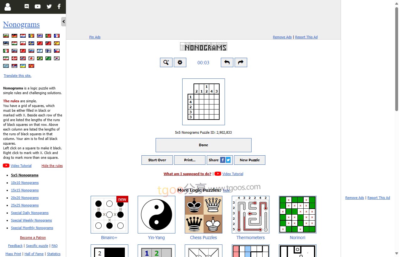 Nonograms – online puzzle game是一个专注于数字绘画谜题的在线游戏平台,提供基于数字逻辑的益智游戏服务,帮助解谜爱好者、逻辑游戏玩家、学生与休闲用户通过数字线索完成像素艺术绘制,锻炼逻辑思维与专注力。该平台支持网页版直接游玩,无需下载安装,适合随时随地的单人解谜挑战。游戏界面简洁直观,规则易于上手但富有深度,通过行与列的数字提示逐步推理出隐藏的图案,常用于日常脑力训练、休闲娱乐与逻辑思维提升。据公开信息,该游戏完全免费,无需注册即可开始游玩,同时提供多种难度级别与谜题数量,适合从入门到进阶的各类玩家。与传统填字游戏或数独相比,Nonograms(又称Hanjie或Paint by Numbers)更注重视觉化推理,完成后的图案往往具有艺术性与惊喜感,为解谜过程增添额外乐趣。