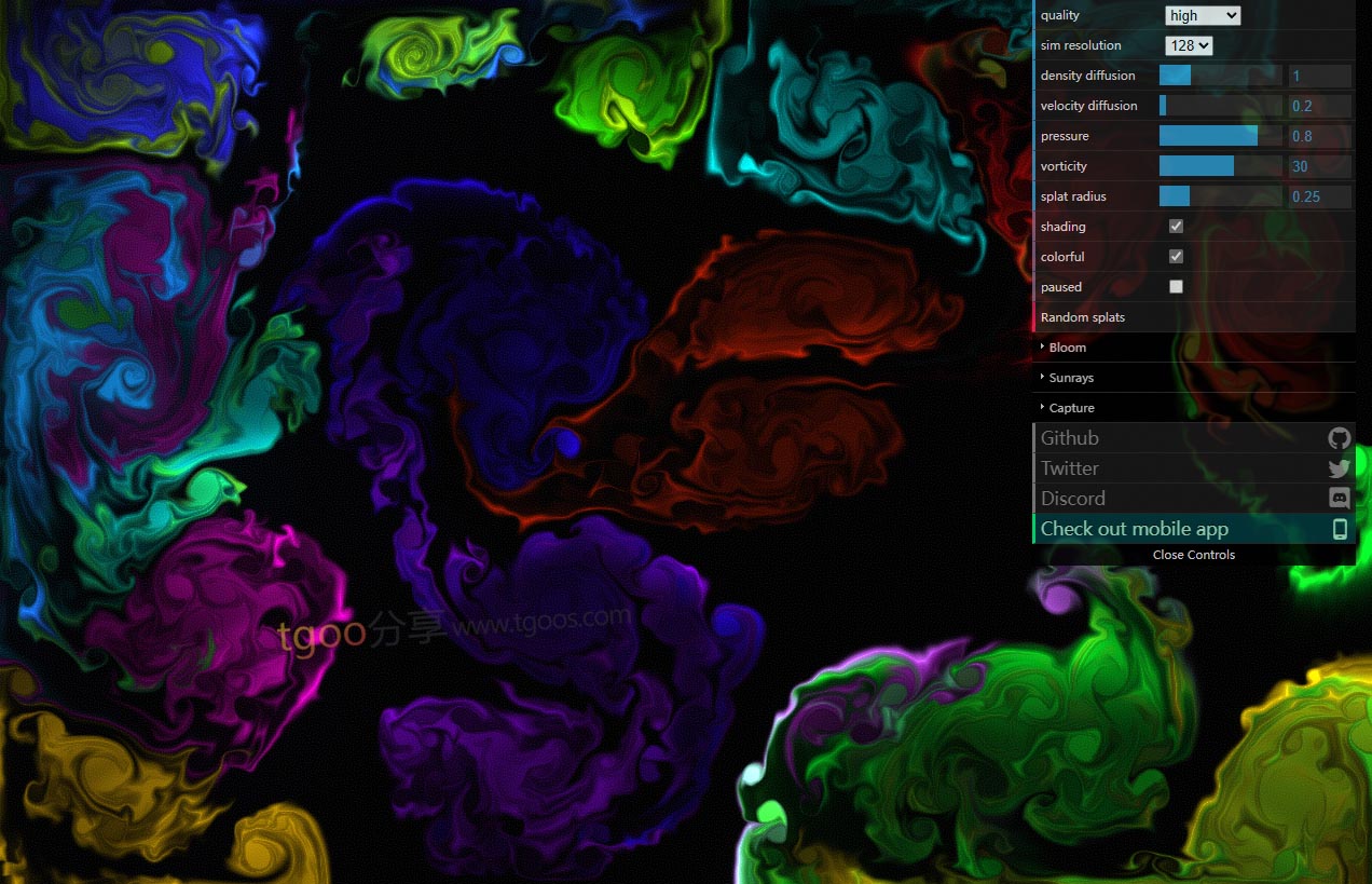 - 交互式参数调整:提供颜色、粘度、速度、力场强度等可调参数,允许用户自定义流体外观与行为,探索不同设置下的视觉变化。适合设计师快速测试多种风格或开发者理解参数对模拟结果的影响。