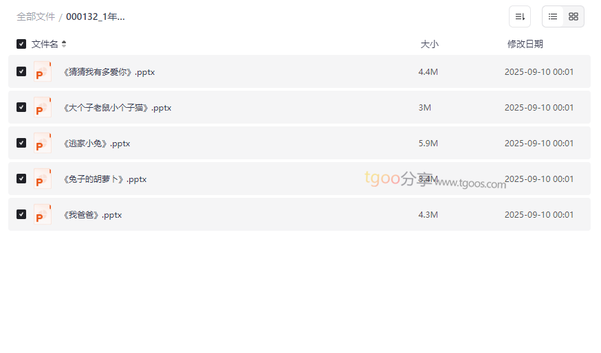 “名著导读”是小学语文教学的重要组成部分,尤其对于1年级学生而言,通过生动有趣的课件引导阅读经典儿童文学作品,能够有效激发学习兴趣和阅读习惯。本资源集合了 《猜猜我有多爱你》《大个子老鼠小个子猫》《逃家小兔》《兔子的胡萝卜》《我爸爸》 五部经典儿童名著的课件PPT,以图文并茂、互动性强的方式呈现内容,适合: