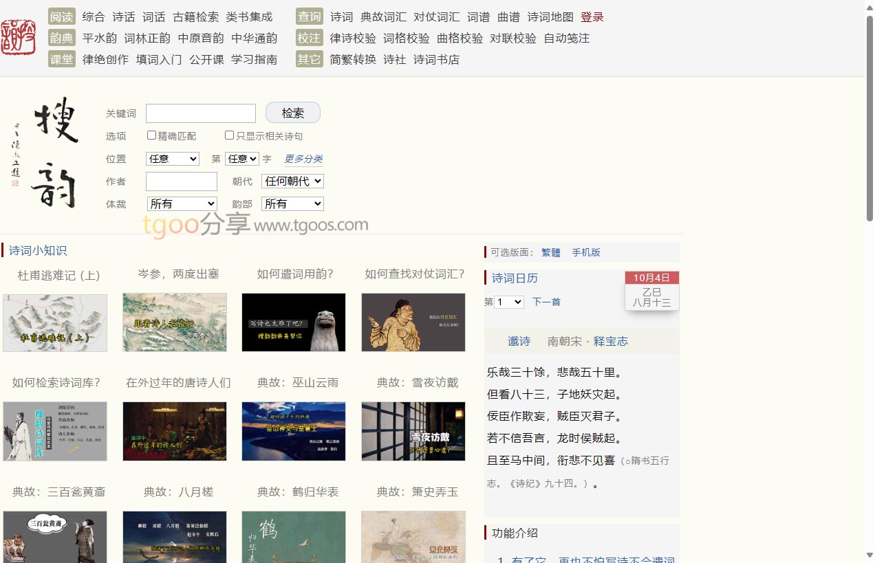 - 诗词检索与资料库:提供从先秦到近代的海量诗词作品,支持按作者、朝代、关键词、体裁等多条件检索,方便用户快速查找古诗文原文与注释。典型场景如学生查询课内诗词、研究者考证作品出处、创作者借鉴前人意象。
