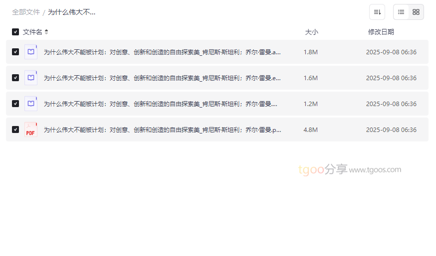 《为什么伟大不能被计划》由肯尼斯·斯坦利与乔尔·雷曼合著,是一本颠覆传统目标导向思维的创新力作。本书通过丰富案例与前沿研究,揭示了伟大成就往往源于无目的探索与自由创造,而非严格规划。本资源集合了 AZW3、EPUB、MOBI、PDF四种主流电子书格式,满足不同设备与阅读习惯的需求,适合: