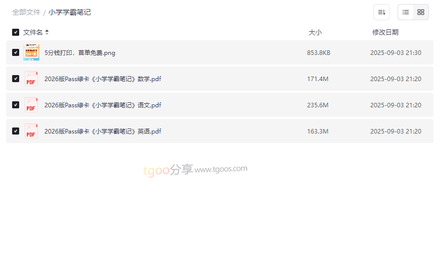 “小学学霸笔记”作为备受家长和学生欢迎的学习辅助工具,以其系统化的知识梳理和高效的学习方法,帮助小学生轻松掌握核心知识点。本资源集合了 2026版Pass绿卡《小学学霸笔记》数学、语文、英语三科完整PDF,以及 5分钱打印优惠指南,将传统笔记与现代化学习需求完美结合,适合: