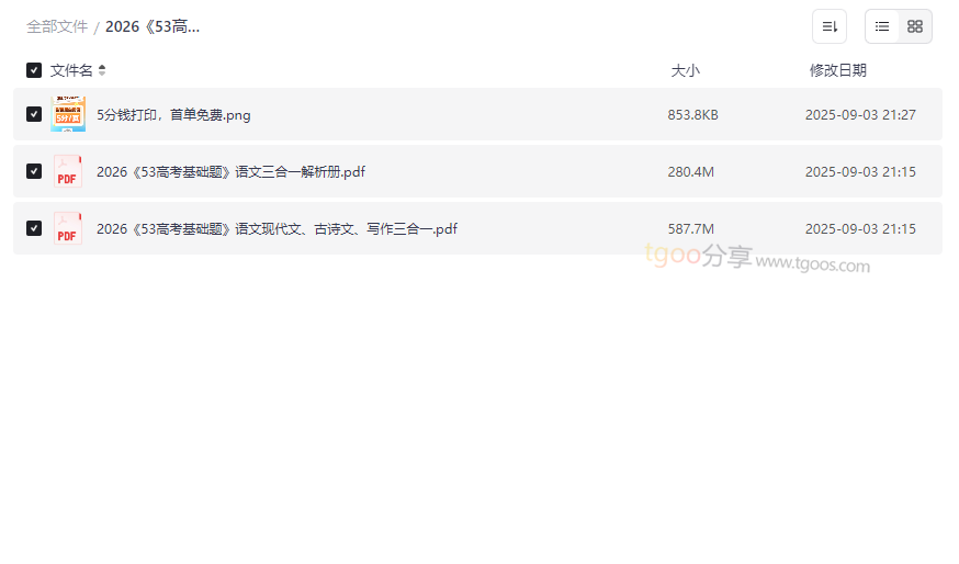 “53高考基础题”系列作为高考备考的权威教辅,深受广大师生信赖。本资源聚焦 2026版《53高考基础题》语文三合一,整合了现代文阅读、古诗文鉴赏与写作三大核心模块,通过系统化题目设计与深度解析,帮助考生高效突破语文高分瓶颈。资源包含 完整解析册、三合一习题集及打印优惠指南,兼具实用性与经济性,适合: