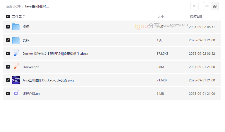 除视频外,资源还提供Docker课件、PPT与课程介绍文档,形成“视+文”双轨学习模式。亮点:文档内容结构清晰,适合复习与笔记整理,帮助巩固知识点。