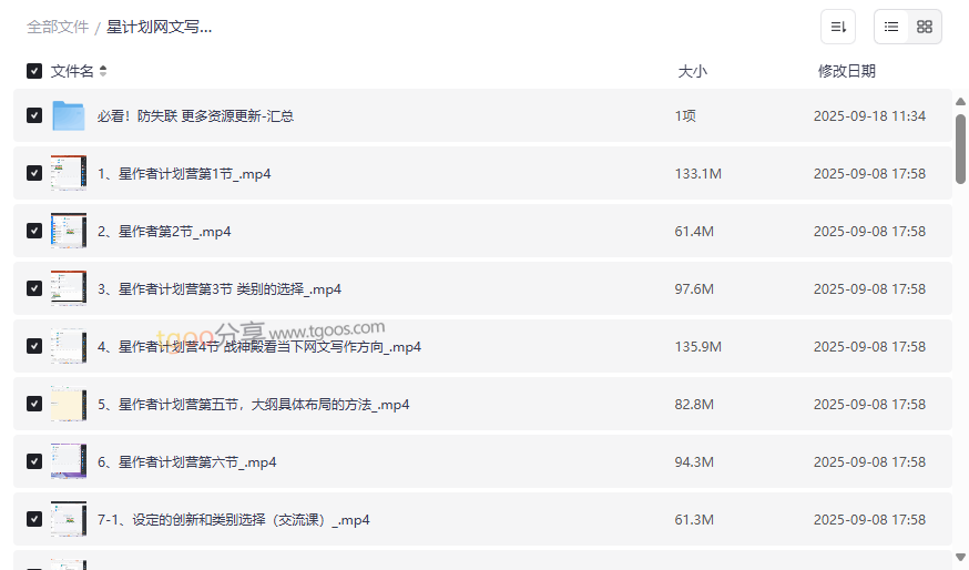 第11节“反向创作 升级版” 引入逆向思维方法,从读者偏好反推创作策略,帮助作品更贴近市场需求。后续课程(如第12-17节)逐步深入人物塑造、情节推进与节奏控制,实现从理论到实践的过渡。亮点:结合案例分析与交流互动,强化实战应用能力。 - 防失联与资源更新