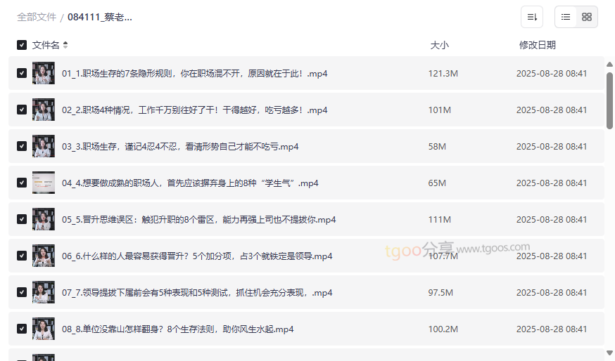 “蔡老师的职场生存攻略40讲”是一套系统化的职场进阶指南,专为现代职场人士量身打造。本资源通过 19节实战课程,深度剖析职场潜规则、晋升策略、沟通技巧与个人成长等关键议题,帮助学习者避开职场陷阱、把握晋升机遇。课程内容涵盖: