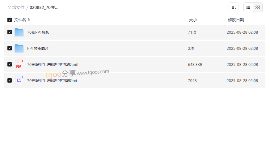 资源包中提供了70套职业生涯规划PPT模板.pdf.txt文件,详细介绍了模板的使用方法、设计理念以及适用场景。这些文档不仅帮助用户快速上手,还提供了职业规划的理论指导,使模板应用更加科学有效。