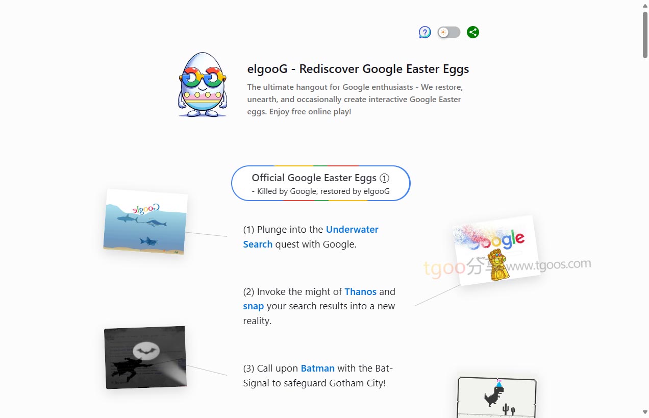 elgooG是一个专注于复活与重现Google复活节彩蛋的趣味互动平台,提供一系列经典Google彩蛋、隐藏游戏与趣味功能的在线体验,帮助Google爱好者、怀旧用户与创意探索者重新发现搜索引擎背后的幽默与惊喜。据公开信息,该站点汇集了历史上著名的Google Doodle游戏、隐藏搜索彩蛋、趣味动画与互动谜题,让用户无需等待特定节日或事件即可随时体验这些短暂存在的创意内容。平台通过网页模拟与交互还原,使访问者能够重温如“吃豆人”Doodle、恐龙跑酷游戏、重力翻转等经典彩蛋,同时也收录了一些鲜为人知的搜索技巧与隐藏功能。elgooG完全免费访问,无需注册,支持多语言界面,适合用于娱乐消遣、创意灵感激发或教学演示。与官方Google搜索相比,elgooG专注于集中展示这些分散且易被遗忘的趣味元素,为用户提供一个持续探索与互动的数字游乐场。
