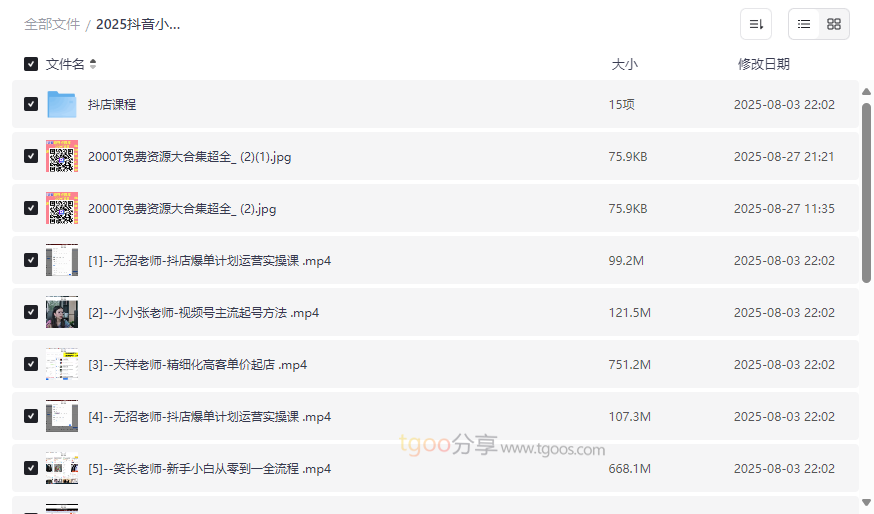 除了核心课程,资源还包含视频号起号方法、网盘自动玩法等补充内容,如“小小张老师-视频号主流起号方法”和“日入500+自动软件网盘玩法”。亮点在于整合多平台运营技巧,帮助用户拓展流量来源与变现渠道,实现全域电商布局。 - 视频号起号方法 | 结合抖音与视频号双平台优势