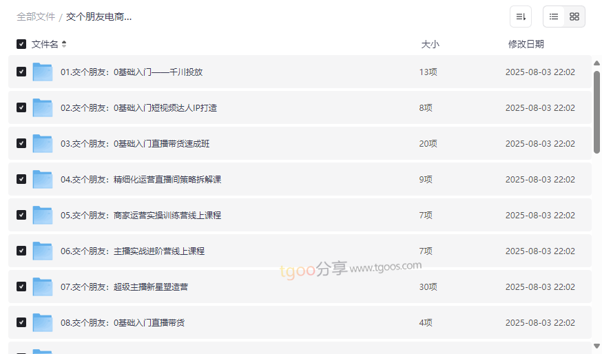 “交个朋友电商运营全套课程”是一套由知名直播电商品牌“交个朋友”官方出品的实战型培训资源,覆盖了直播带货、千川投流、短视频IP打造、选品策略、主播培训、本地生活运营等电商全链路核心模块。本资源整合了从0基础入门到高阶运营的19大模块课程,包含超过200节视频课程及配套资料手册,将理论与实操深度结合,帮助学员快速掌握电商变现技能。这套高质量网盘资源合集特别适合: