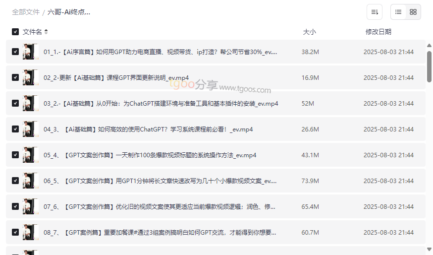 “六哥AI终点站”是一套专为电商、视频制作和设计行业打造的全系统AI商业闭环矩阵课程。本资源深度整合了ChatGPT环境搭建、高效使用技巧、爆款文案创作、直播话术优化、电商实战案例等12大AI联合应用模块,旨在帮助从业者系统掌握AI工具,显著降低运营成本高达70%。课程内容覆盖从基础入门到高阶实战,适合: