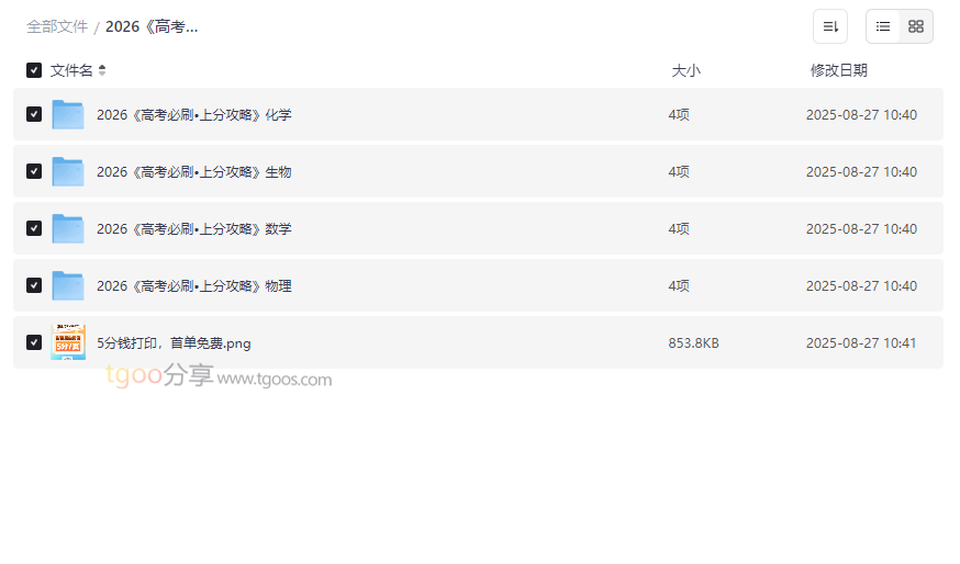 “高考必刷•上分攻略”系列是针对2026年高考考生量身打造的高效复习资源,覆盖数学、物理、化学、生物四大理科核心科目。本资源整合了 上分攻略、上分题集、详细解析及便捷打印服务,形成“学—练—解—印”一体化备考方案,特别适合: