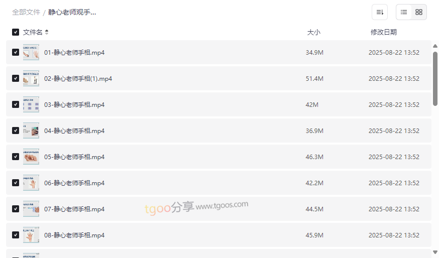 “静心老师观手看健康课程”是一套结合传统手相学与现代健康理念的实用视频教程。通过观察手掌的纹路、色泽、形态等特征,静心老师系统性地揭示了手部与人体健康的深层关联。本资源共包含30集高清视频,内容涵盖基础手相知识、常见健康问题的手部表现、以及日常保健的实用技巧。这套课程不仅适合对传统养生方法感兴趣的爱好者,也为希望提升自我健康管理能力的人群提供了直观易懂的学习材料。适用人群包括: