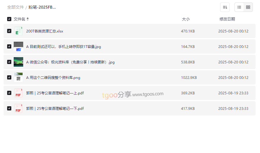 关键词整合:粉笔公考、2025考公、言语理解笔记、郭熙名师、公务员备考、网盘资源、高效学习、真题解析、逻辑填空、片段阅读共 7 个文件 2.9M
