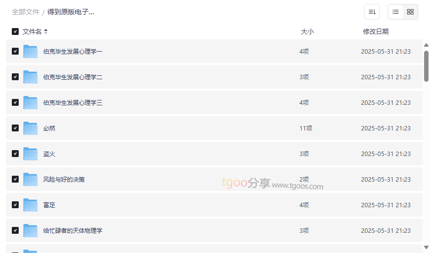 “得到”作为国内领先的知识服务平台,汇聚了众多高质量电子书资源,涵盖心理学、科技、历史、文学等多个领域。本资源集合了 59册精选原版电子书,包括《伯克毕生发展心理学》系列、《人类简史》三部曲、《李开复人工智能》等热门书籍,以及多格式支持(如PDF、EPUB、MOBI),满足不同设备的阅读需求。这些资源适合: