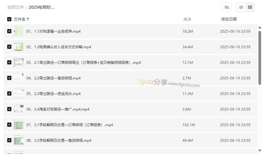随着电商行业的快速发展,淘宝/天猫平台的财务对账成为电商财务人员必备的核心技能之一。本资源《2025电商财务淘系对账必学》系统性地整理了淘系平台对账逻辑、数据导出路径、字段处理技巧、收入成本确认、费用核算及报表生成等全流程内容,通过18节实操视频课程,帮助学习者高效掌握电商财务对账的核心方法。资源紧跟2025年电商财务趋势,结合真实业务场景,适合: