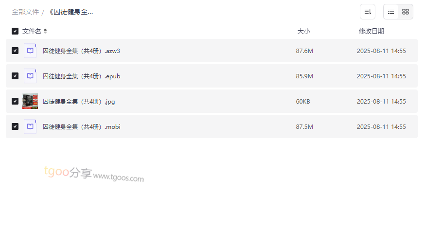 《囚徒健身全集》作为全球知名的无器械健身指南,以其独特的训练理念和实用性在全球健身爱好者中广受推崇。本资源集合了 全套四册电子书(AZW3、EPUB、MOBI格式)及封面图片,全面覆盖从基础到进阶的徒手健身方法,将传统健身与现代科学结合,适合: