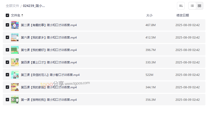 “简小知口才训练营”是一套专为提升个人表达与沟通能力而设计的实战训练课程。本资源集合了 七大主题课程,涵盖自信表达、趣味叙事、家庭介绍、家乡描述、爱好分享、口才技巧强化 等多维度内容,通过系统化教学与情景模拟,帮助学员从基础到进阶全面提升口才。课程采用视频教学形式,生动直观,适合: