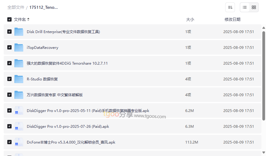 在数字化时代,数据丢失已成为常见问题,无论是误删文件、硬盘损坏还是系统崩溃,都可能造成不可逆的损失。本资源集合了 Tenorshare 4DDiG、Disk Drill、R-Studio、万兴数据恢复专家、手机数据恢复工具 等多款专业软件,覆盖电脑与移动设备,提供全方位的数据恢复解决方案。这些工具不仅支持多种文件格式和存储介质,还具备高恢复率与用户友好界面,适合: