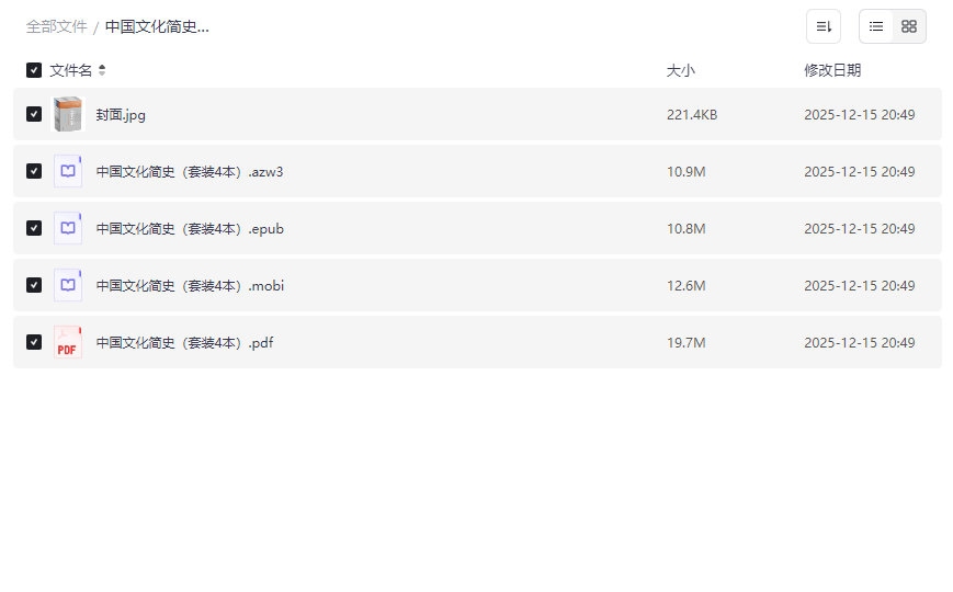 “中国文化简史”作为一套系统梳理中华文明脉络的经典读物,深受广大读者喜爱。本资源集合了 套装4本电子书、多格式高清版本(PDF、EPUB、MOBI、AZW3)、历史资料与国学经典整合 等丰富内容,将传统文化知识与现代数字阅读完美结合,适合: