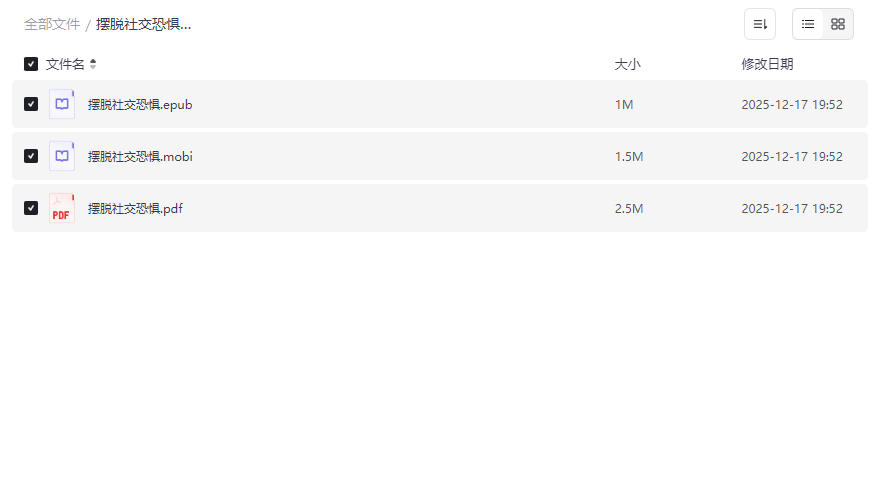 “社交恐惧”是许多人在现代社会中面临的普遍挑战,影响着个人在职场、社交场合乃至日常生活中的自信与表现。本资源集合了 全格式电子书(EPUB、MOBI、PDF)、配套影视资源文档 等多样化素材,旨在通过系统化的内容帮助用户逐步克服社交障碍。无论是理论指导还是实践支持,这份资源都提供了全面的解决方案,适合: