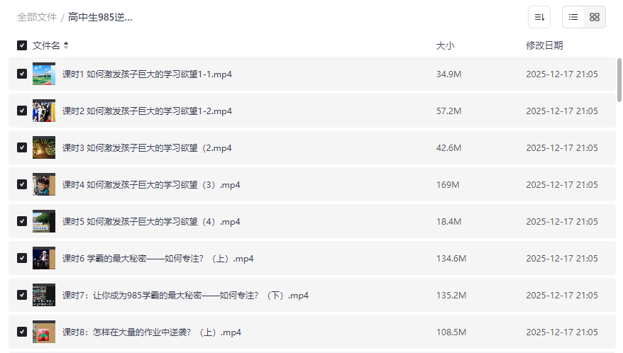 “高中生985逆袭计划”是一套专为高中生量身打造的高效学习与提分系统课程,融合了学习动力激发、专注力训练、作业高效处理、英语速成技巧、错题攻克方法及听课提分策略等核心模块。本资源以2025年学霸同款方法论为基础,帮助学生在繁重学业中实现突破,不仅提升成绩,更培养自主学习能力与良好习惯,是冲击985/211名校的实用指南。适合: