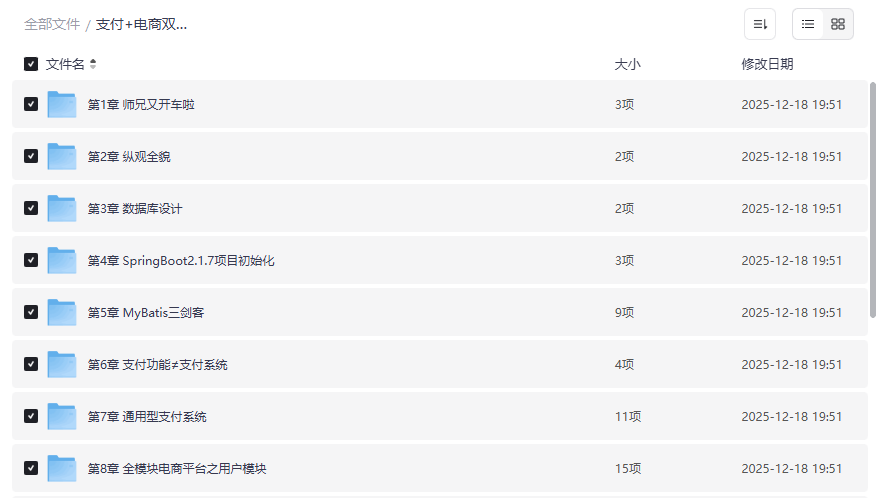 “支付+电商双系统玩转Java技术栈”是一套专为Java开发者设计的实战型综合课程,通过构建完整的支付系统和全模块电商平台,帮助开发者掌握企业级应用开发的核心技能。本资源整合了SpringBoot2.1.7、MyBatis三剑客、支付系统架构、电商全模块开发等关键技术栈,将理论与实践紧密结合,适合: