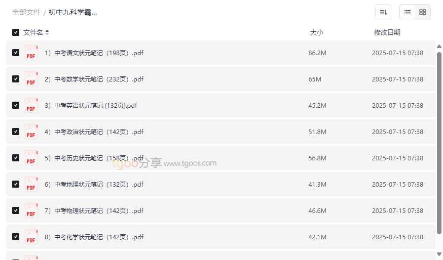 “初中九科学霸笔记”是一套全面覆盖中考九大科目的高质量学习资料,汇集了历年中考状元的精华笔记,内容系统、重点突出。本资源整合了 语文、数学、英语、政治、历史、地理、物理、化学、生物 等全科笔记,每份均由高分学霸精心整理,结合中考考点与易错点解析,帮助初中生高效梳理知识体系、强化记忆、提升应试能力。这套资源适合: