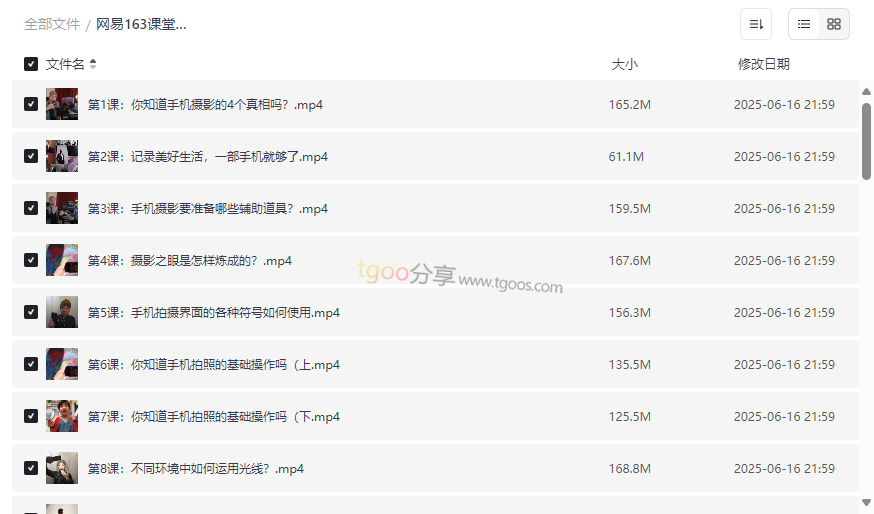 在当今社交媒体盛行的时代,用手机拍出高质量照片已成为一项必备技能。网易163课堂推出的贾树森手机摄影课,专为零基础用户设计,覆盖从基础操作到创意拍摄的全方位内容。本资源集合了 19节系统视频课程,包括光线运用、构图技巧、人像与美食拍摄等实用模块,帮助用户轻松掌握手机摄影精髓,拍出令人惊艳的朋友圈高赞大片。无论你是摄影小白还是希望提升技能的爱好者,这套课程都能提供专业指导,适合: