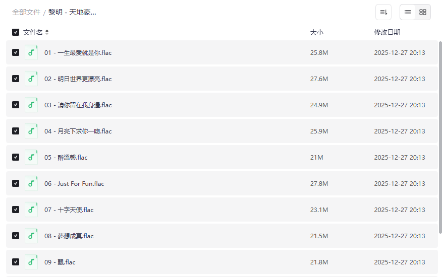 专辑收录了黎明巅峰时期的代表作,包括《情深说话未曾讲》《只要为我爱一天》等经典歌曲。FLAC无损格式完美保留了原始录音的细节与动态范围,人声清澈、伴奏层次分明,让每首歌曲都焕发新生。 - 主打金曲 | 情感饱满,旋律动人