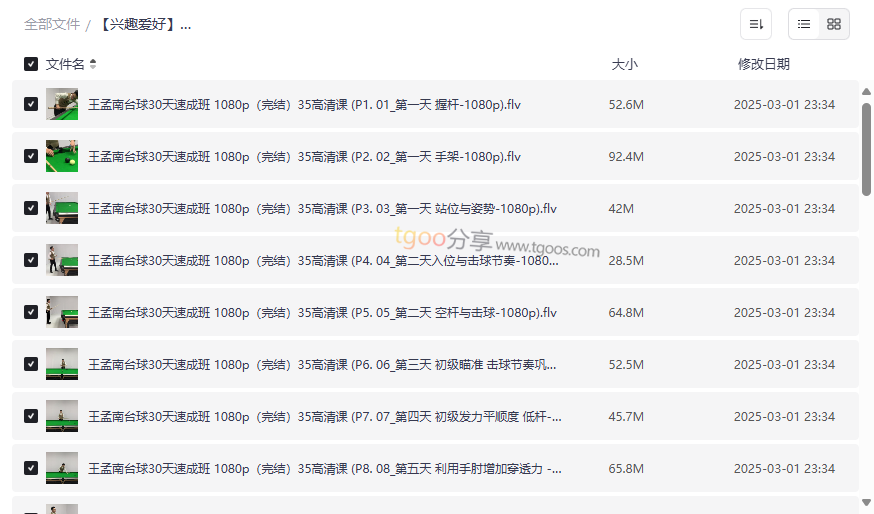 台球作为一项兼具技巧与策略的运动,深受广大爱好者的喜爱。本资源《王孟南台球30天速成班》是一套系统化、结构化的高清视频教程,覆盖从基础握杆、站位到高级加塞走位、清台思路的全方位教学内容。通过35节精心设计的课程,帮助学习者逐步掌握台球核心技术,无论是零基础新手还是希望提升水平的进阶玩家,都能从中获益。这套资源特别适合: