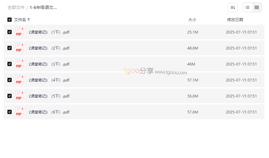 “1-6年级语文下册《课堂笔记》”是一套专为小学生设计的语文学习辅助资源,覆盖了小学全年级下册的语文课程内容。这套资源以系统化知识点梳理、重点难点解析、课文精讲与拓展练习为核心,将课堂学习与课后复习紧密结合,帮助孩子轻松掌握语文知识。无论是预习新课、巩固课堂内容,还是备考期末考试,这份高质量网盘资源合集都能提供高效的学习支持,适合: