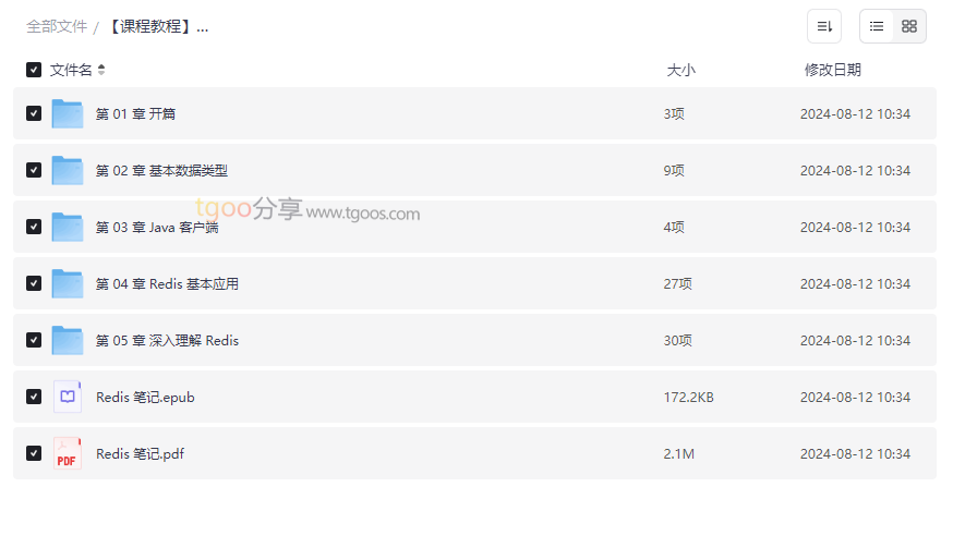 课程附赠Redis笔记(EPUB/PDF格式),系统梳理各章节重点,方便离线复习与快速查阅。笔记内容与视频互补,强化学习效果。