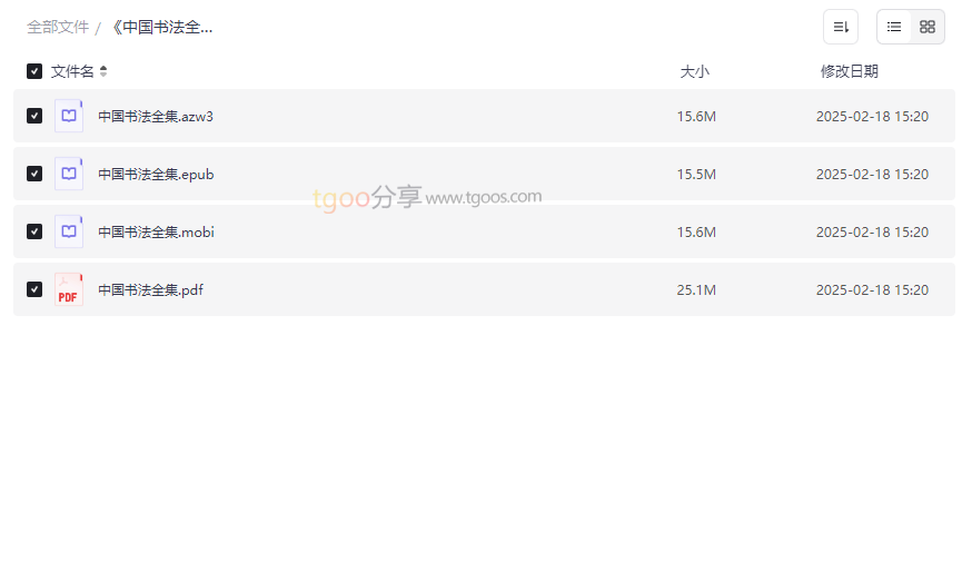 “中国书法全集”作为一部收录中国历代书法精品的权威合集,是书法爱好者和文化研究者的必备资源。本资源集合了 多种电子书格式,包括AZW3、EPUB、MOBI和PDF,全面覆盖不同设备的阅读需求,将传统书法艺术与现代数字技术结合,适合: